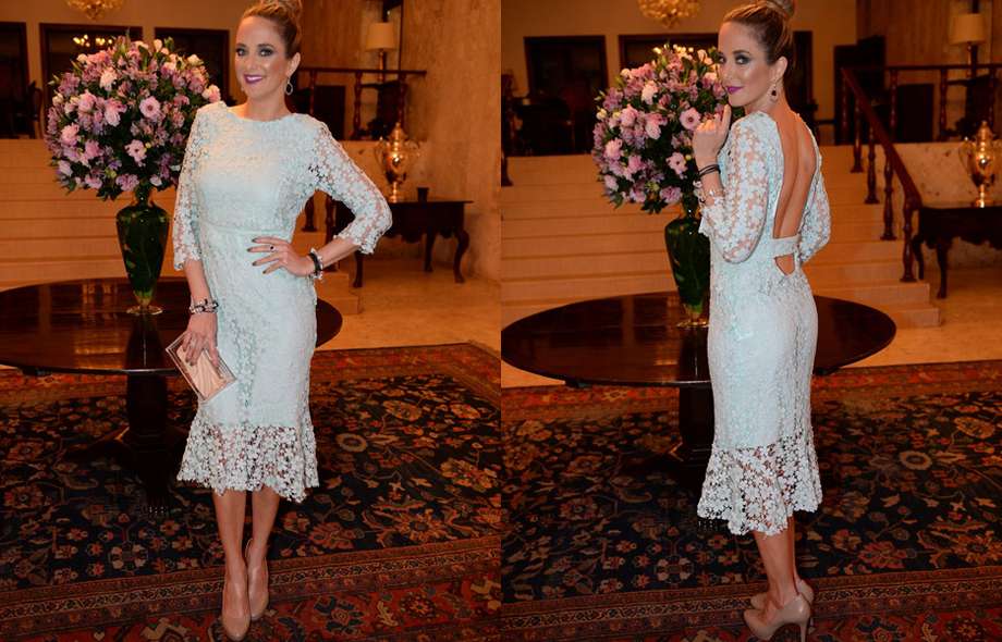 Ticiane escolheu um vestido longuete rendado de flores, cor gelo, com um decote nas costas. Clutch e sapatos nudes completaram o visual.